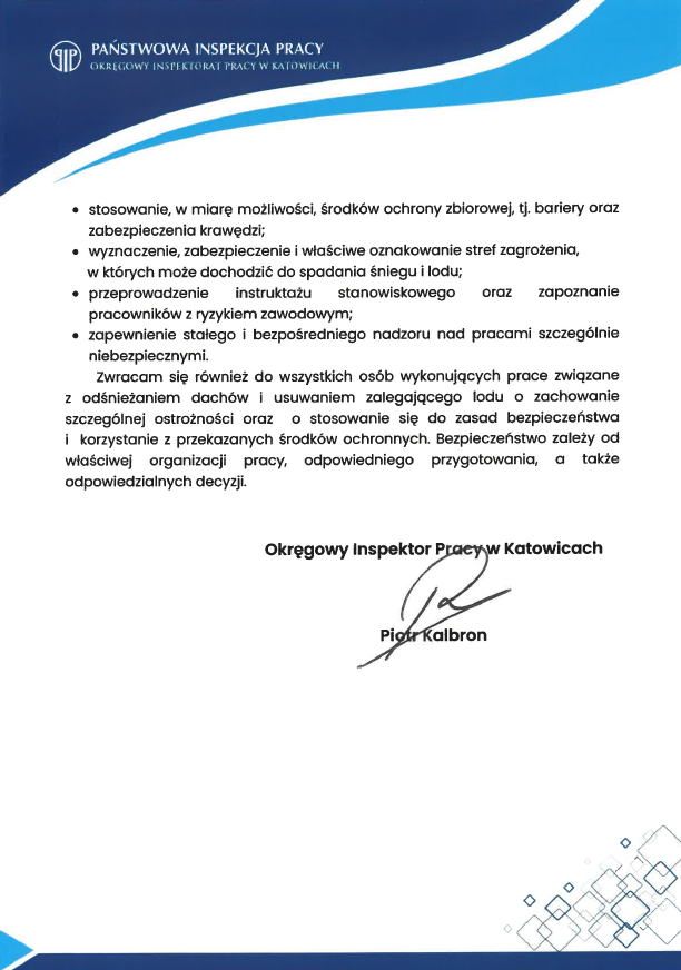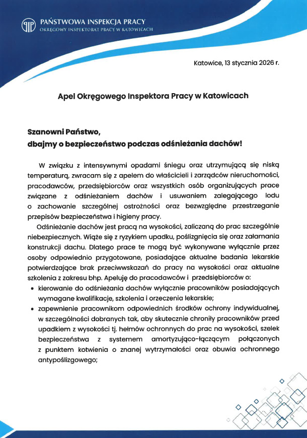 W związku z występującymi opadami śniegu oraz utrzymującą się niską temperaturą Okręgowy Inspektor Pracy w Katowicach Piotr Kalbron zwraca się z apelem do właścicieli i zarządców nieruchomości, pracodawców, przedsiębiorców oraz wszystkich osób organizujących prace związane z odśnieżaniem dachów i usuwaniem zalegającego lodu o zachowanie szczególnej ostrożności oraz przestrzeganie przepisów bezpieczeństwa i higieny pracy.
