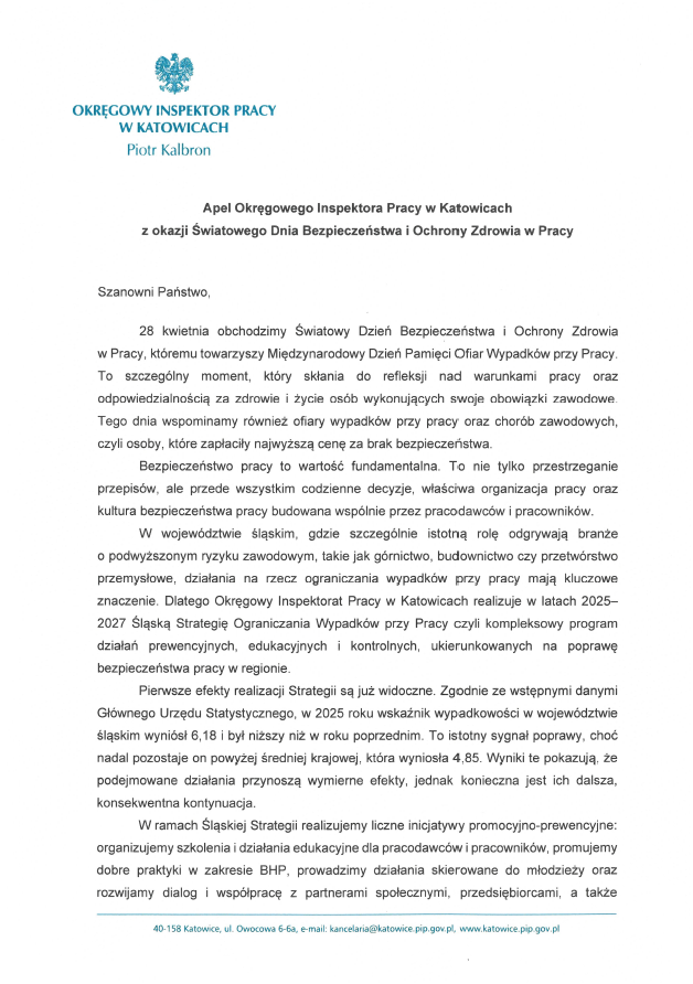 Dlatego apeluję do Pracodawców z województwa śląskiego o tworzenie środowiska pracy sprzyjającego nie tylko bezpieczeństwu fizycznemu, ale również zdrowiu psychicznemu pracowników, poprzez właściwą organizację pracy, jasną komunikację, przeciwdziałanie mobbingowi i budowanie kultury wzajemnego szacunku. Apeluję także do Pracowników o odpowiedzialne podejście do własnego bezpieczeństwa, stosowanie przepisów i zasad BHP oraz reagowanie na wszelkie nieprawidłowości i zagrożenia.