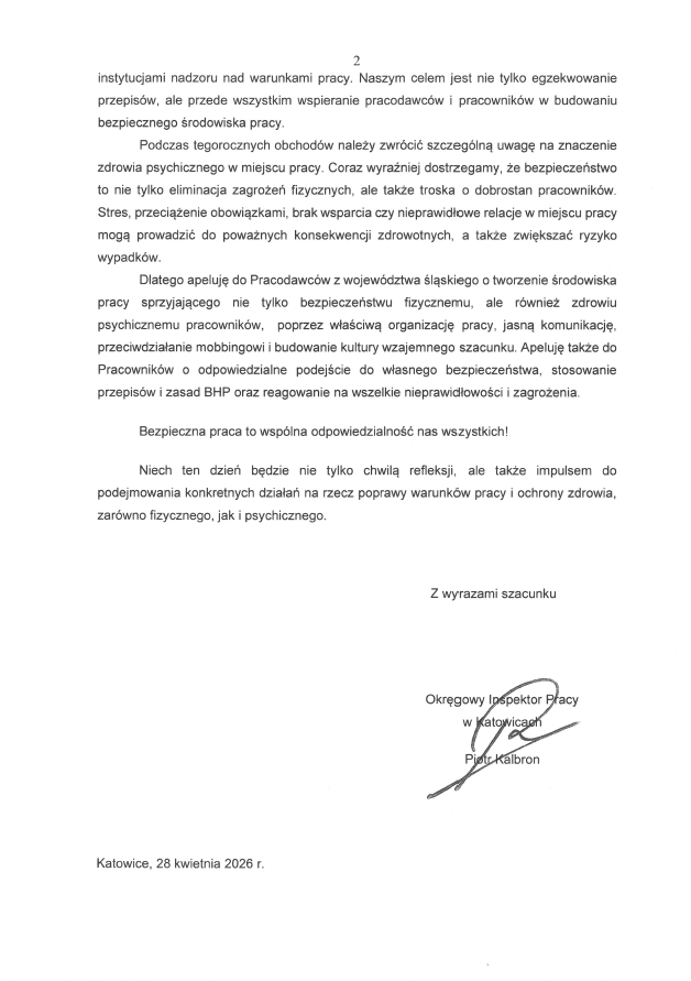 Niech ten dzień będzie nie tylko chwilą refleksji, ale także impulsem do podejmowania konkretnych działań na rzecz poprawy warunków pracy i ochrony zdrowia, zarówno fizycznego, jak i psychicznego.