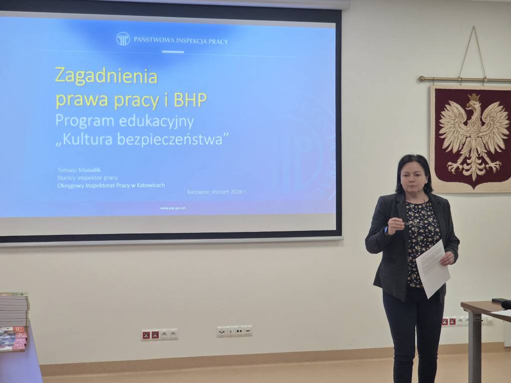 Koordynator programu edukacyjnego „Kultura bezpieczeństwa” z ramienia OIP w Katowicach omówiła jego dotychczasowy przebieg, przedstawiła cele oraz założenia programu na rok szkolny 2025/2026, przekazała też informacje o konkursie „Poznaj swoje prawa w pracy” w roku 2026. Tomasz Musialik, starszy inspektor pracy z Okręgowego Inspektoratu Pracy w Katowicach przeprowadził szkolenie na temat aktualnie obowiązujących przepisów prawa pracy.