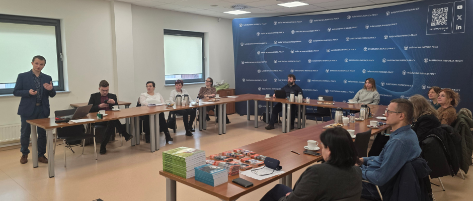 Nauczyciele biorący udział w spotkaniu otrzymali materiały edukacyjne i informacyjne Państwowej Inspekcji Pracy.