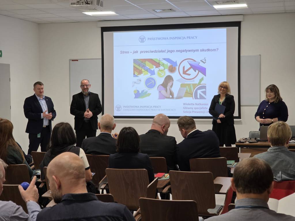 Pierwszą część szkolenia dotyczącą stresu w pracy poprowadziła Wioletta Natkaniec – główny specjalista w Sekcji Prewencji i Promocji OIP w Katowicach. W trakcie wystąpienia omówiono zagadnienia związane z mechanizmem powstawania stresu zawodowego, jego przyczynami oraz objawami. Przedstawiono psychologiczny model stresu, etapy reakcji organizmu na sytuacje stresowe oraz konsekwencje długotrwałego napięcia psychicznego dla zdrowia i funkcjonowania pracownika. Zwrócono również uwagę na zjawisko wypalenia zawodowego oraz znaczenie odporności psychicznej w radzeniu sobie z trudnymi sytuacjami zawodowymi. Uczestnicy zapoznali się także z praktycznymi metodami ograniczania stresu w pracy, takimi jak techniki relaksacyjne, właściwa organizacja pracy, zarządzanie czasem oraz dbanie o równowagę pomiędzy życiem zawodowym a prywatnym.