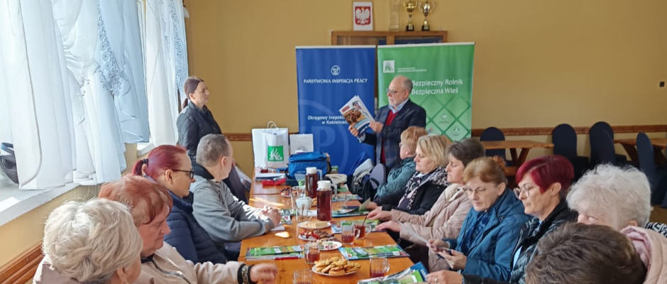 Podczas spotkania Arkadiusz Kusa, starszy inspektor pracy z Okręgowego Inspektoratu Pracy w Katowicach omówił podstawowe zasady bezpieczeństwa i higieny pracy w gospodarstwach rolnych. Szczególną uwagę poświęcono najczęstszym przyczynom powstawania wypadków przy pracy. Przedstawiono również zasady bezpiecznego użytkowania maszyn i urządzeń rolniczych, właściwego postępowania ze zwierzętami gospodarskimi, a także reguły dotyczące stosowania i przechowywania substancji niebezpiecznych.