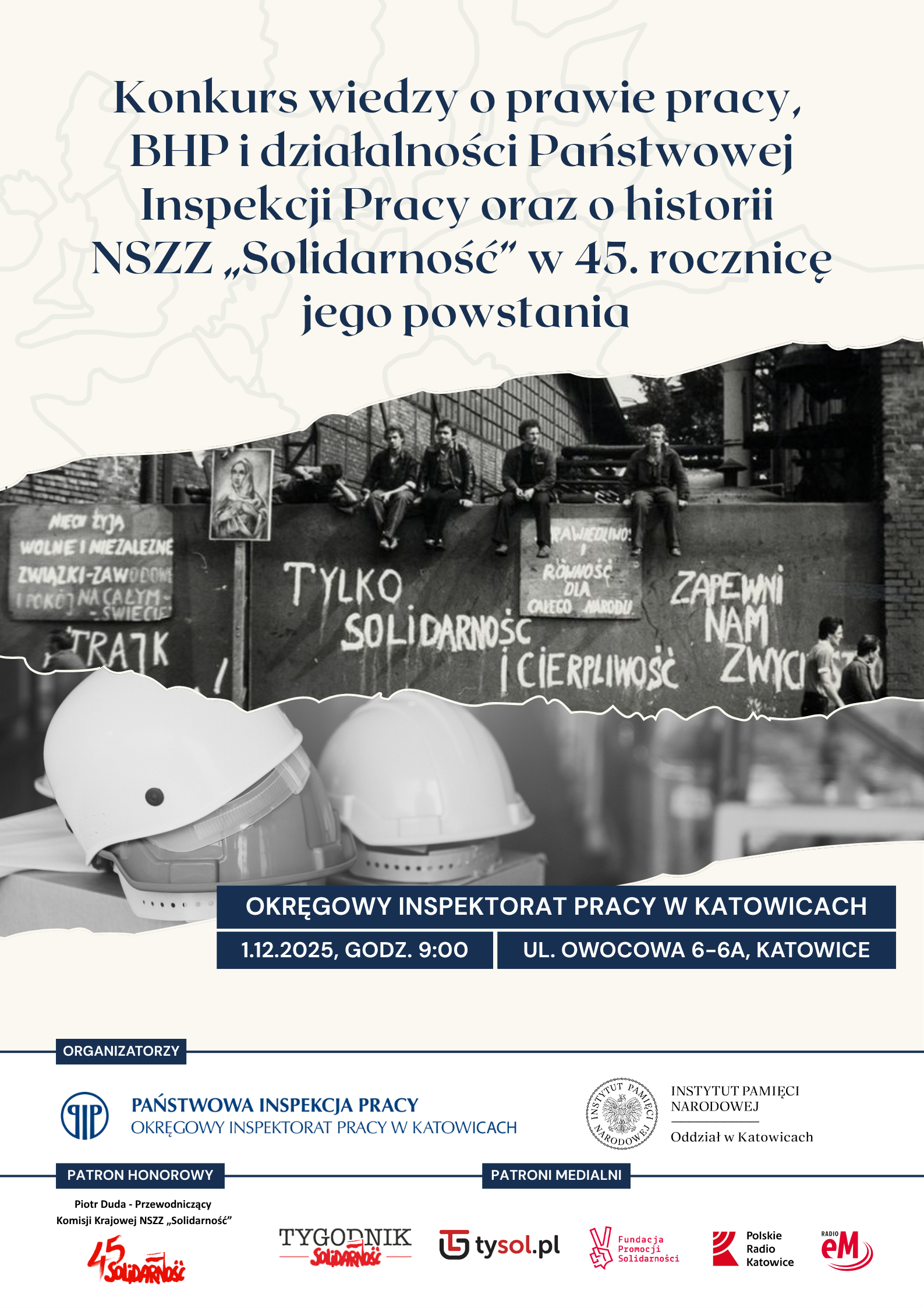 Dnia 1 grudnia 2025 roku w siedzibie Okręgowego Inspektoratu Pracy w Katowicach odbędzie się finał „Konkursu wiedzy o prawie pracy, bhp i działalności Państwowej Inspekcji Pracy oraz historii NSZZ „Solidarność” w 45. rocznicę jego powstania”.