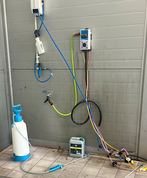 Miejsce wypadku - na zdjęciu widoczny opryskiwacz (inny będący na wyposażeniu myjni z usuniętym zaworem bezpieczeństwa) oraz instalacja sprężonego powietrza. |