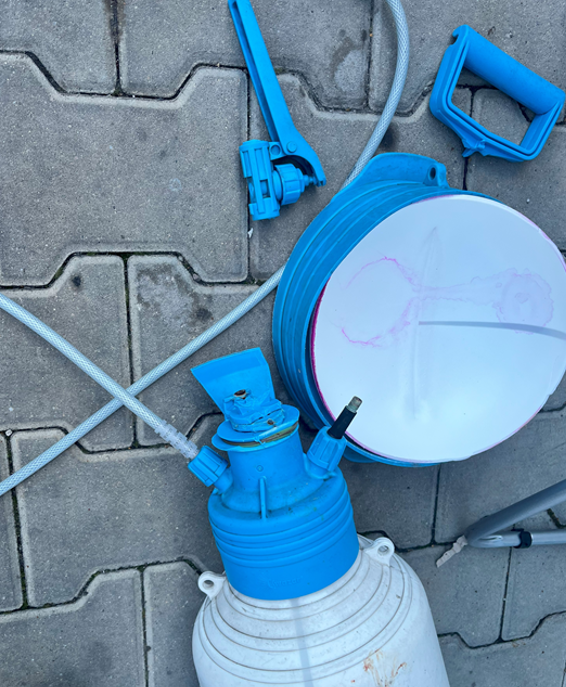 - nieuprawniona ingerencja w konstrukcję opryskiwacza, polegająca na usunięciu zaworu bezpieczeństwa i zamontowaniu w jego miejscu zaworu umożliwiającego pompowanie zbiornika przy użyciu sprężonego powietrza;