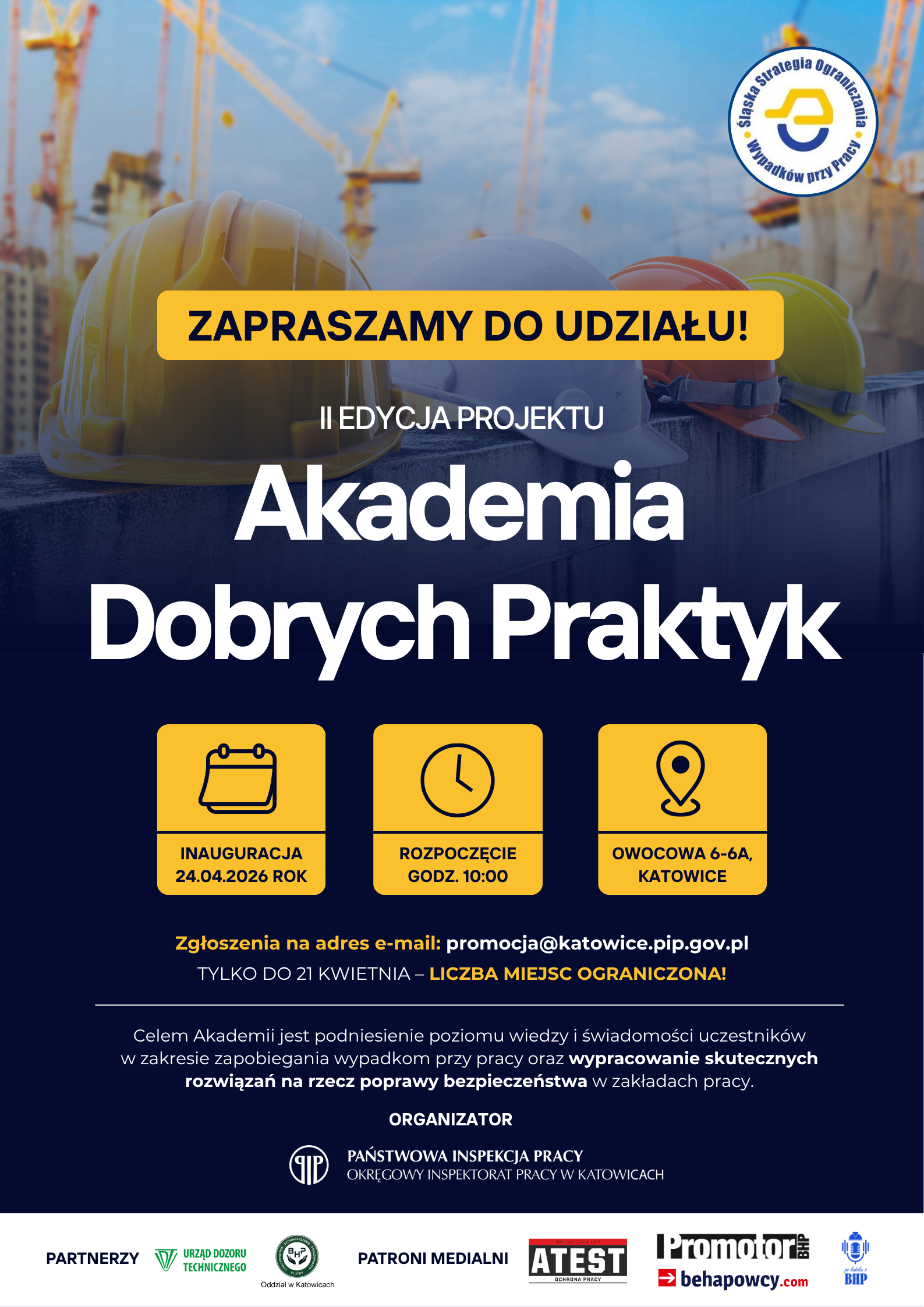 Zgłoszenia do udziału w Akademii przyjmowane są drogą mailową na adres promocja@katowice.pip.gov.pl do 21 kwietnia 2026 r. Liczba miejsc ograniczona.